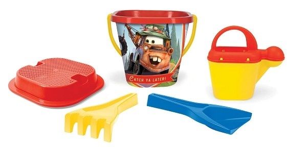 Sada hraček na písek Auta obsahující kyblík, sítko, konvičku a hrabičky s lopatkou.