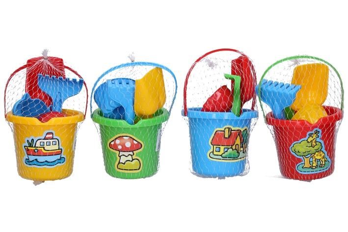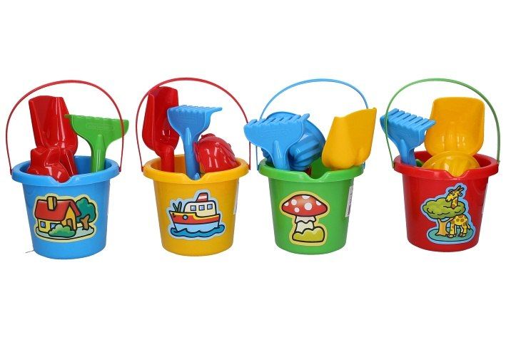 Sada na písek malá kyblík 10x11 cm. Obsah balení - kyblík 10x11cm, hrábě, lopatka, 3xformičky (rybka, bábovka, kačenka). 4 varianty - modrá, červená, žlutá, zelená.