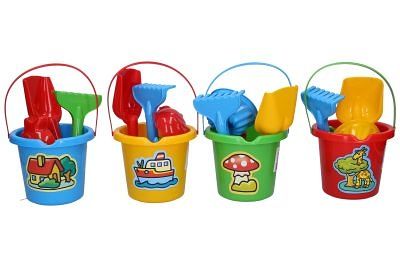 Sada na písek malá kyblík 10x11 cm. Obsah balení - kyblík 10x11cm, hrábě, lopatka, 3xformičky (rybka, bábovka, kačenka). 4 varianty - modrá, červená, žlutá, zelená.