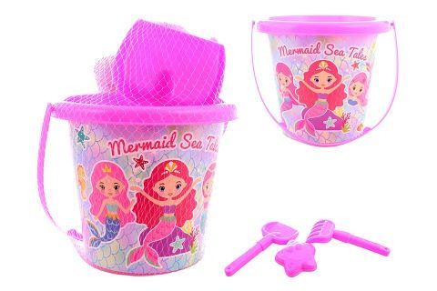 Sada na písek obsahuje kyblík, hrabičky, lopatku a formičku ve tvaru hvězdičky. Baleno v síťce. Rozměry kyblíku cca 13x15 cm. Věk 3+