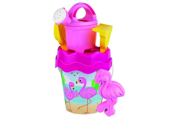 Sada na písek Plameňák obsahuje kyblík, sítko, konvičku, bábovku ve tvaru Plameňáka, hrabičky a lopatku. Vyrobeno z kvalitního plastu v Itálii.