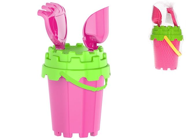 Sada na písek růžová - kbelík 15cm,lopatka,hrabičky,sítko 10m+ v síťce
