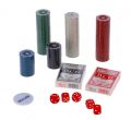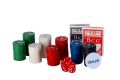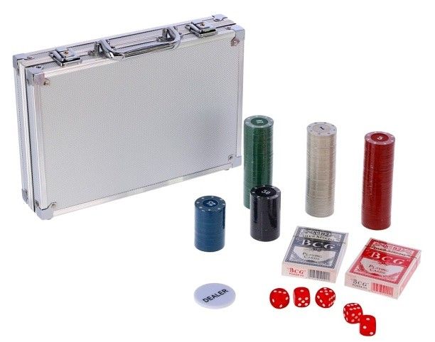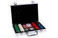 Sada na poker v kufříku – sada obsahuje hrací žetony v hodnotě 1, 5, 10, 25 a 50, dva balíčky pokerových karet, žeton a 5 hracích kostek. Vše v praktickém kovovém kufříku.