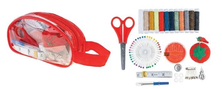 Sada na šití obsahuje: jehly, náprstek, nůžky, houbičku na jehly, spícnací špendlíky, knoflíky, metr krejčovský.
