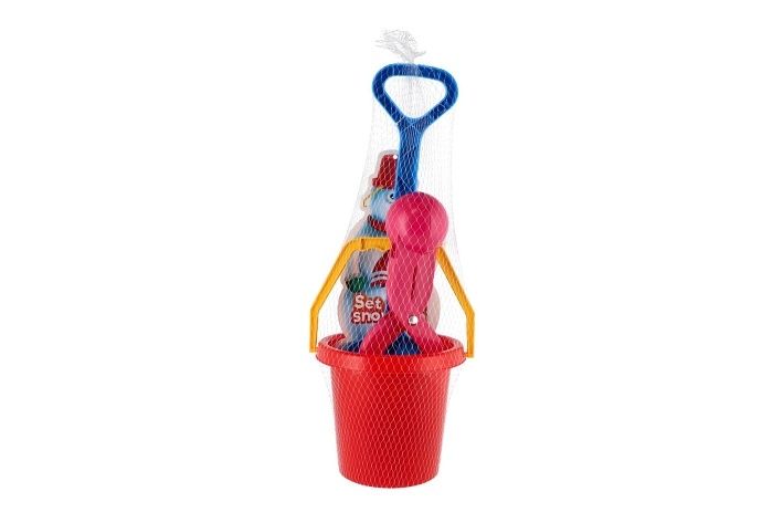 Sada na stavění sněhuláka plast kbelík,tvořítko na koule,lopatka,mrkev,knoflíky v síťce 20