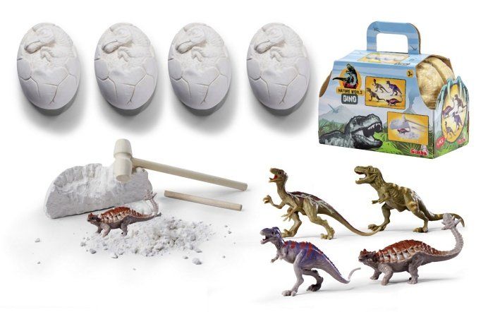 Sada na vykopání figurky dinosaura ukrytého ve vajíčku o velikosti 10 cm. 4 druhy dinosaurů o velikosti 8-9 cm. Součástí je nářadí na vykopávání.