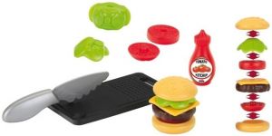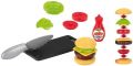 Sada na výrobu hamburgerů. Vytvořte si hamburger. Nakrájejte zeleninu nožem na prkénku a položte ji na sendvič s hamburgerem a omáčkou. Obsah: 1 prkénko 1 nůž 1 chléb 1 hamburger 1 plátek sýra 1 láhev omáčky 2 druhy zeleniny.