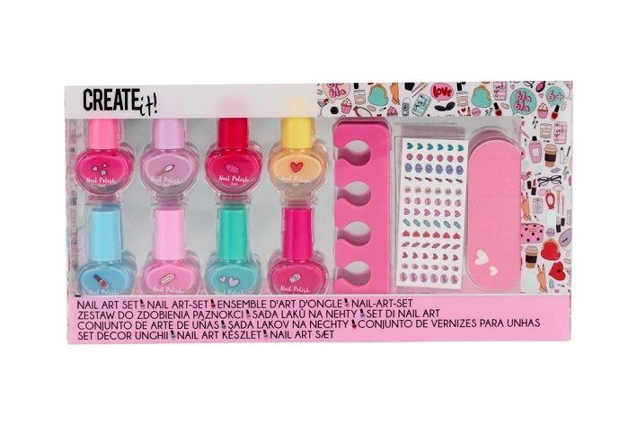 Staň se opravdovou umělkyní s Create it! Nail Art Set a proměň své nehty v malé umělecké dílo. Vyber si jednu z osmi třpytivých barev laků na nehty, nalakuj je podle nálady a pak je dozdob roztomilými samolepkami a třpytivými kamínky, které dodají tvému stylu ještě více záře. Díky praktickým růžovým oddělovačům prstů na nohou se nemusíš bát rozmazaného laku – malování nehtů bude snadné a zábavné.Pozvi kamarádky a užijte si společný čas při tvoření sladěných nehtů, protože když se k sobě hodíte, je to vždycky vítězství!Produkty Create it! jsou dermatologicky testované, bez parabenů a nejsou testované na zvířatech, takže jsou bezpečné a vhodné pro dívky ve věku 6–14 let. Obaly jsou vyrobeny z recyklovatelného PET a FSC certifikovaného papíru a jejich hravý design podporuje kreativitu a sebevyjádření.