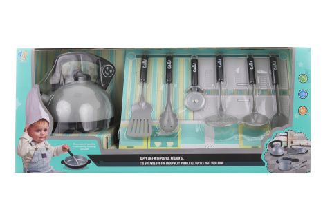 Sada kuchyňského nádobí s doplňky. Obsahuje konvici, obracečku, naběračku, a mnoho dalších doplňků. Rozměry balení cca 51 x 23 x 15 cm. Materiál: plast. Věk 3+
