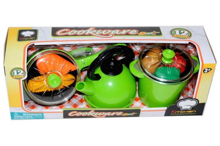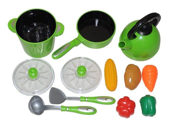Sada nádobí obsahuje konvici, pánev, hrnec a různá jídla.