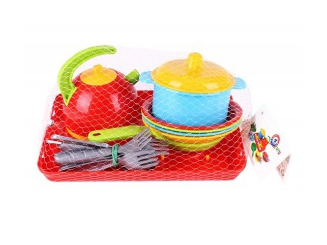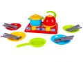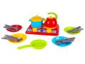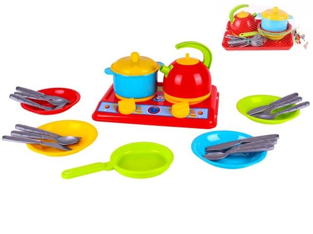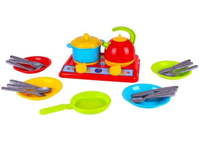 Pořiďte dětem náčiní, ať mohou vařit s vámi. Sada nádobí obsahuje konvici, hrnec, pánev, talíře, příbory a vařič. Vhodné pro děti od 12 měsíců.