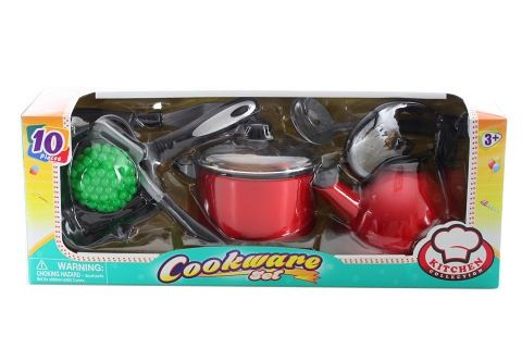 Sada kuchyňského nádobí s doplňky. Obsahuje hrnec, konvičku, pánev, obracečky a zeleninu. Rozměry balení cca 38 x 12 x 14 cm. Materiál: plast. Věk 3+