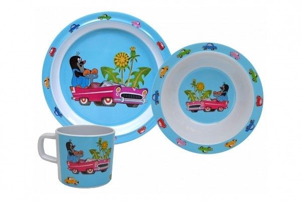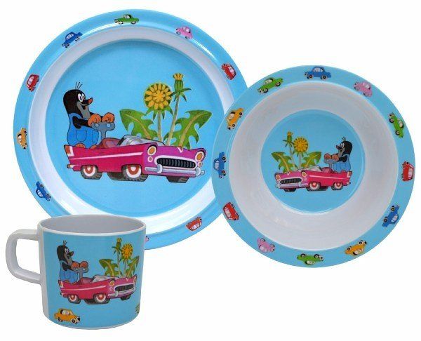 Dárková třídílná sada dětského nádobí s motivem Krtečka a autíčka. Sada obsahuje talířek o průměru 21cm, misku o pr.16cm a hrneček s jedním uchem- výška 6,5cm. Materiál 100% melamin bez ftalátů. Nepoužívat v mikrovlnné troubě! Možno mýt v myčce. Tuto sadu ocení každý malý jedlík a večeře tak bude zároveň zábava.