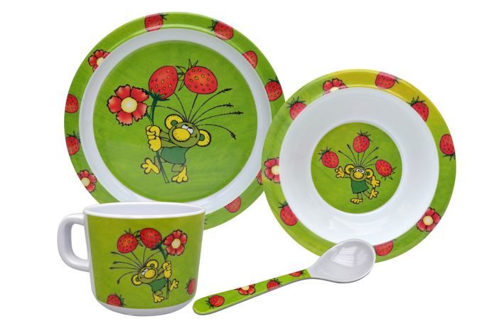 4dílná dárková sada dětského nádobí. Sada obsahuje talířek pr.21cm, misku pr.16cm, hrneček s jedním uchem v.6,5cm a lžičku d.15cm. Materiál 100% melamin bez ftalátů. Nepoužívat v mikrovlnné troubě! Možno mýt v myčce.