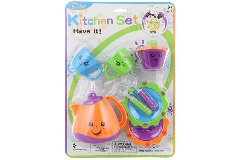 Sada nádobí s obličeji. Balení obsahuje 2 hrnečky, 2 talířky, 2 lžičky, konvičku a misku. Rozměry balení cca 25,5 x 36 x 8 cm. Věk 3+