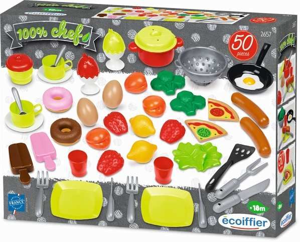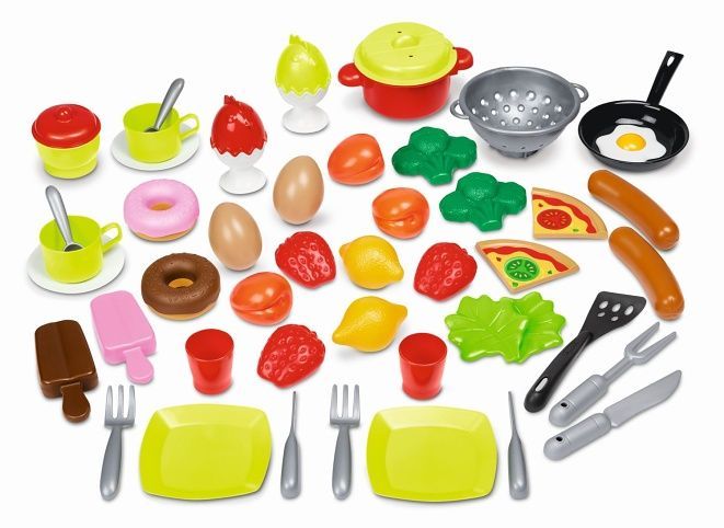 Rozsáhlá sada obsahuje nádobí a příbory pro dvě osoby, různé hrnce v různých velikostech, kuchyňské náčiní, misky na vejce a spoustu maket jídla. S dobrým úchopem a bez ostrých hran je tento doplněk pro hrací kuchyňky vhodný již pro děti od 18 měsíců. Vyr
