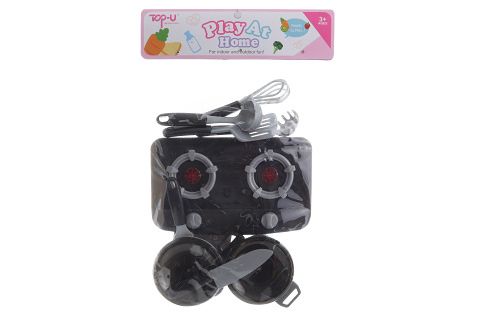 Sada nádobí s vařičem. Balení obsahuje vařič o velikosti cca 23 x 13 cm, hrnec, pánev, 2 pokličky, nůž a další doplňky. Vařič svítí a vydává zvuky. Napájení na 2 AA baterie (nejsou součástí). Rozměry balení cca 27 x 42 x 6 cm. Věk 3+