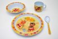 4dílná dárková sada dětského nádobí. Sada obsahuje talířek pr.21cm, misku pr.16cm, hrneček s jedním uchem v.6,5cm a lžičku d.15cm. Materiál 100% melamin bez ftalátů. Nepoužívat v mikrovlnné troubě! Možno mýt v myčce.