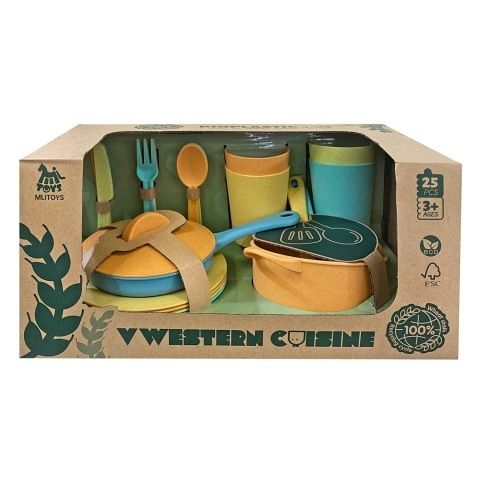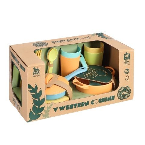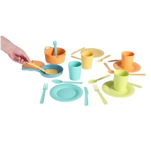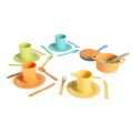 Sada nádobí z bioplastu – sada obsahuje 4 talířky, 4 kelímky, pánvičku, pokličku, sadu příborů, kastrůlek a naběračky.