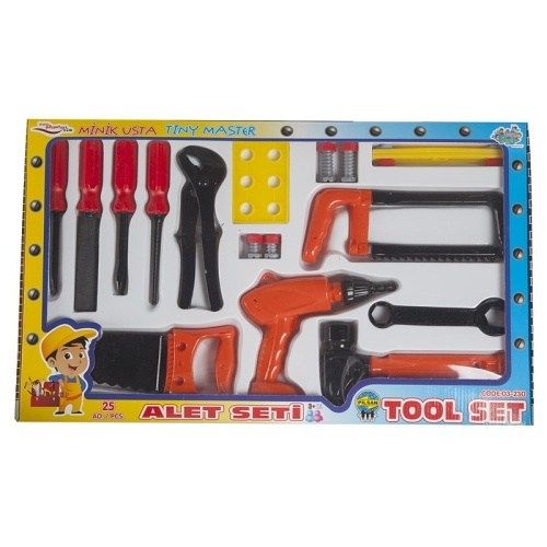 Sada nářadí pro malé kutily. Obsahuje 25 ks různého nářadí – pilka,šroubovák,vrtačka,maticový klíč,hasák a další.