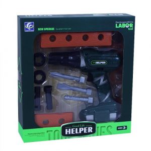 Sada nářadí s vrtačkou na baterie. V balení najdeš také šroubky a další součástky. Vrtačka funguje na 2 x 1.5V AA baterie, které nejsou součástí balení.