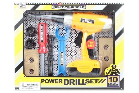 Sada nářadí s vrtačkou. Obsahuje vrtačku, která se při stisknutí točí a vrčí (bezbateriový provoz), šroubovák, klíč, dřívka a šroubky. Rozměry vrtačky cca 22 x 16 cm. Rozměry balení cca 28 x 23 x 5,5 cm. Věk 3+