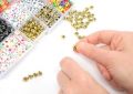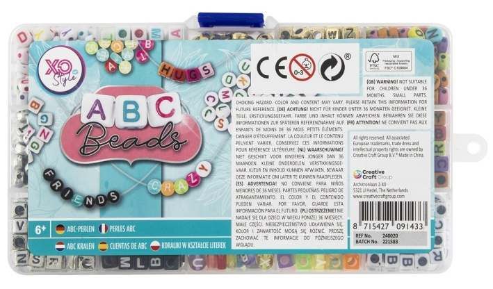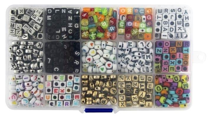 Sada navlékacích korálků s písmenky ABC – sada obsahuje 15 druhů navlékacích korálků spísmenky. Uloženo v praktickém zavíracím boxu.