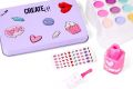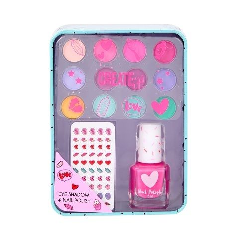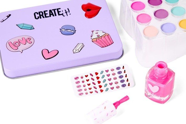 Rozzáříš svůj look s kouzelnou sadou Create it! Eyeshadow and Nail Polish v plechové dóze. Roztomilé zelené balení s fialovými detaily je nejen krásným doplňkem tvé kosmetické sbírky, ale hlavně skrývá vše, co potřebuješ k dokonalé proměně. Nejprve si můžeš vybrat z dvanácti zářivých barev očních stínů a vytvořit hravé líčení přesně podle své nálady. Poté přichází na řadu nehty, nanes lak, ozdob je třpytivými kamínky a dodej svému stylu extra jiskru.Ať už si užíváš líčení sama, nebo společně s kamarádkou při zábavném makeoveru, výsledek bude vždy malým uměleckým dílem.Produkty Create it! jsou dermatologicky testované, bez parabenů a nejsou testované na zvířatech, takže jsou bezpečné a vhodné pro dívky ve věku 6–14 let. Obaly jsou vyrobeny z recyklovatelného PET a FSC certifikovaného papíru a jejich hravý design podporuje kreativitu i sebevyjádření.