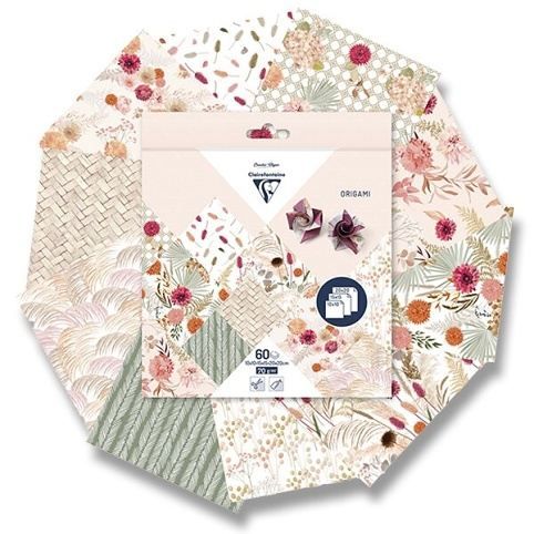 Sada papírů Clairefontaine Origami. Origami je známé japonské umění skládání papíru. Zábavné a přístupné všem, od začátečníků až po pokročilé tvůrce. Jednotlivé listy jsou se vzorem na přední straně a hladké na zadní straně. Balení obsahuje 60 listů s motivy suchých květin. Gramáž 70 g,,Balení obsahuje mix velikostí: 10 x 10 cm, 15 x 15 cm a 20 x 20 cm.