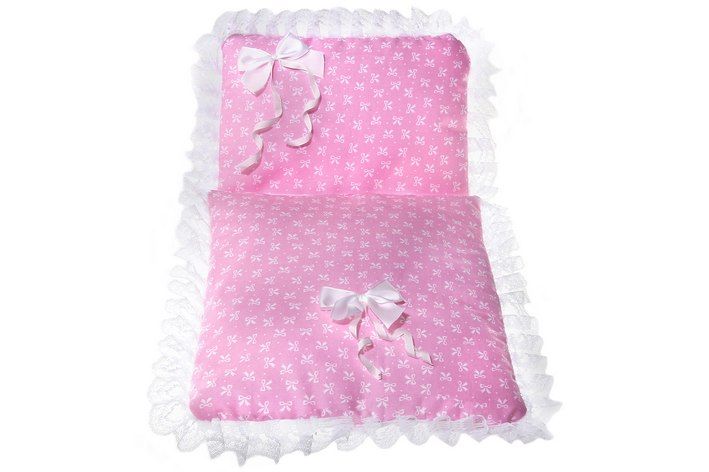 Sada peřinka + polštářek. Peřinka do postýlky nebo kolébky nesmí chybět v žádné výbavě pro panenku! Tato praktická souprava obsahuje polštářek,peřinku, zdobená silonovou krajkou a mašličkami.