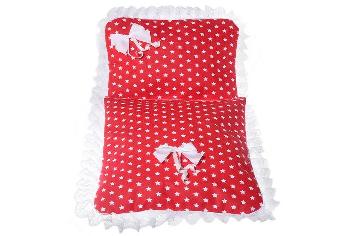 Sada peřinka + polštářek. Peřinka do postýlky nebo kolébky nesmí chybět v žádné výbavě pro panenku! Tato praktická souprava obsahuje polštářek,peřinku, zdobená silonovou krajkou a mašličkami.