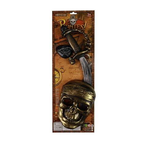 Exkluzivní sada pro všechny malé piráty! Tento parádní set obsahuje bronzovou masku na gumičku, klapku na oko a meč s bronzovou rukojetí. Tyto super doplňky jsou ideální k pirátskému kostýmu! Vše je vyrobeno z PVC.