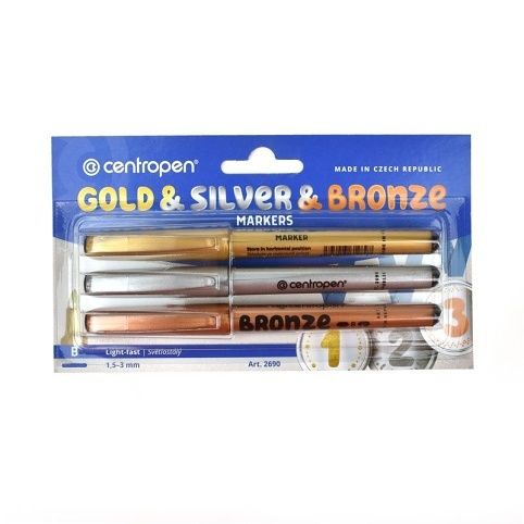 Sada popisovačů v bronzové, stříbrné a zlaté barvě. Je vhodný pro dekorování a psaní na světlých i tmavých papírech, výborný i pro pamětní alba. Inkoust je permanentní na porézních materiálech, polopermanentní na plastech, kovech, skle a některých textiliích.