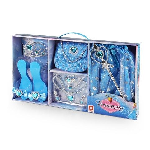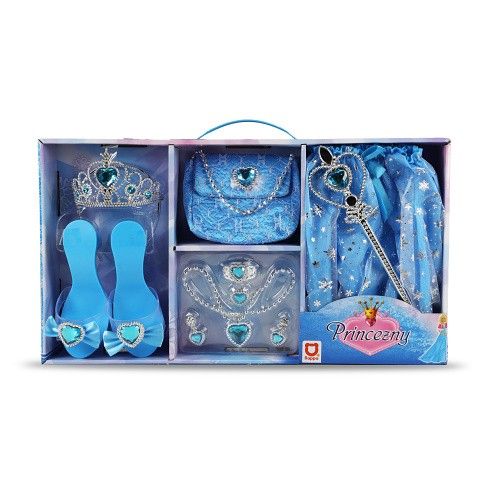 Sada v modrém provedení pro každou malou princeznu. Součástí balení je vše, co správná princezna potřebuje. Jsou to střevíčky, korunka, kabelka a další doplňky.