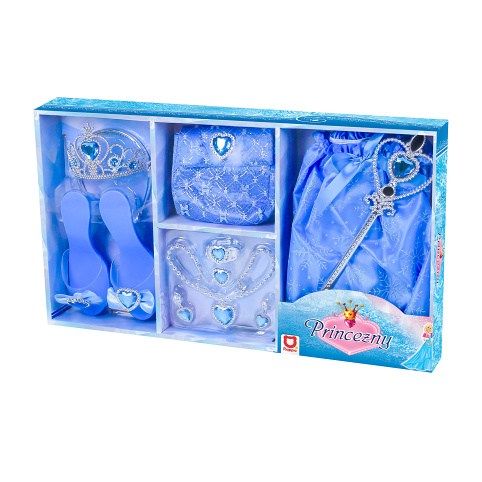 Sada v modrém provedení pro každou malou princeznu. Součástí balení je vše, co správná princezna potřebuje. Jsou to střevíčky, korunka, kabelka a další doplňky.