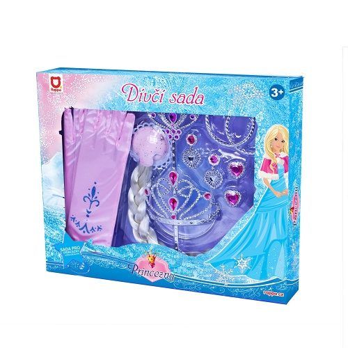 Exkluzivní sada pro všechny malé princezny! Krásná korunka s náušnicemi, prstýnky, hůlkou, náramky a rukavicemi. Doplňky jsou zdobeny růžovými prvky. Součástí je dlouhý cop v blond provedení. Perfektní sada ke kostýmu! Doporučeno pro děvčata od 3 let.