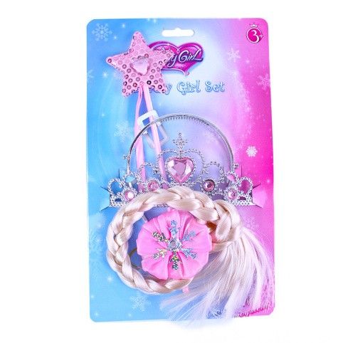 Překrásný set korunky, hůlky a copu pro všechny princezny! Korunka je dekorována ozdobnými kamínky v růžové barvě. Perfektní doplněk ke kostýmu!