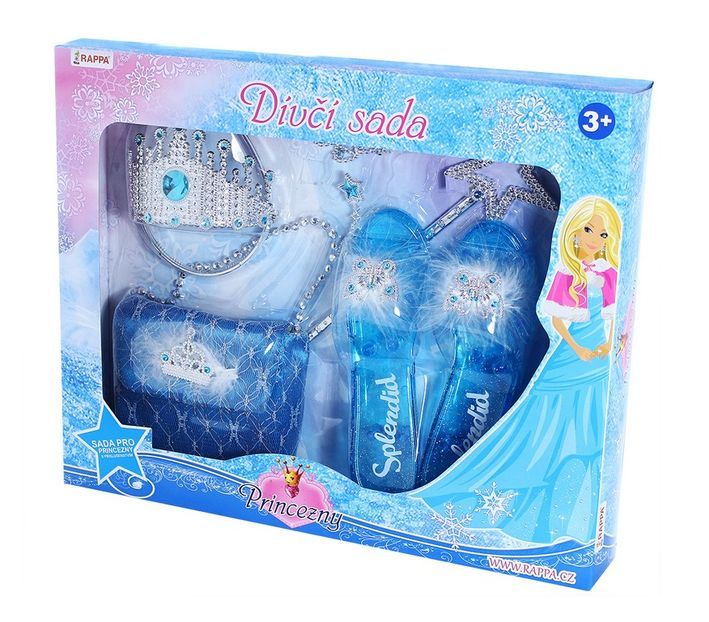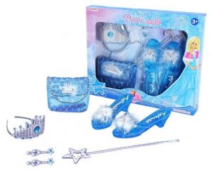 Krásná sada pro zimní princezny. Set obsahuje střevíčky, kabelku, čelenku, korunku, náušnice a hůlku. Všechny prvky této sady jsou perfektní ke kostýmu. Velikost střevíčků je cca 19 cm. Doporučeno pro děvčata od 3 let.