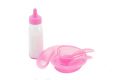 Sada obsahuje lahev s mlékem, mističku se lžičkou a vidličkou.