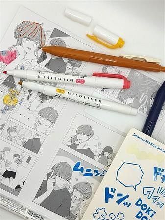 Obsah sady: 1x omalovánky, 1x arch samolepek, 3x zvýrazňovač Mildliner (modrá, žlutá, červená), 2x gelové pero Sarasa Clip (tmavě modrá, velbloudí žlutá)