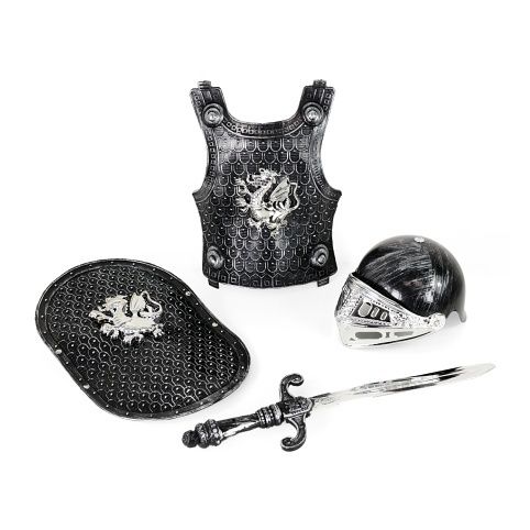 Balení obsahuje úchvatný stříbrný meč, ochranný štít, helmu s nastavitelným krytem a rytířskou vestu.