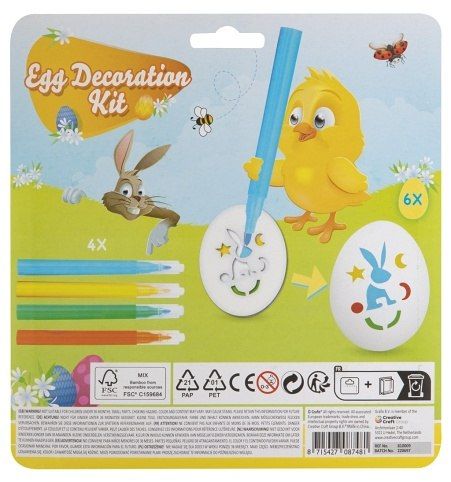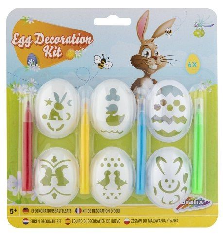 Sada šablon na malování velikonočních vajíček – obsahuje 6 různých šablon, které přiložíte na vajíčko a přiloženými fixami (4 ks ve velikočních barvách) vajíčka namalujete.