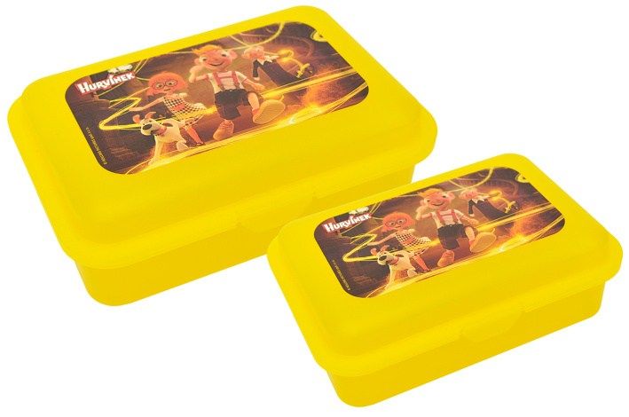 Sada dvou plastových boxů s automatickým uzávěrem. Na svačinu do školy či na výlet. S obrázkem filmového Hurvínka. Obsah 1,0L+0,5L.