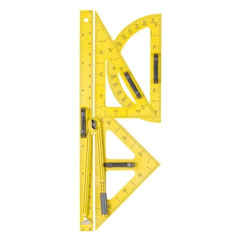 set obsahuje: pravítko 100 cm,2 x trojúhelník 45° a 60°, úhloměr, kružítko