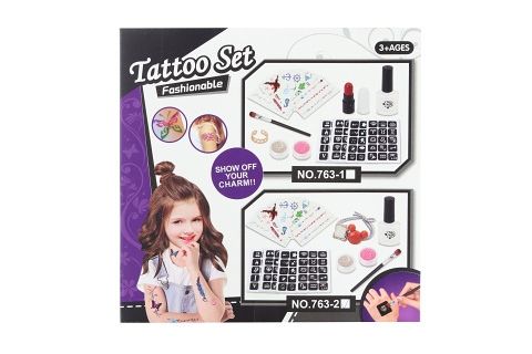 Sada obsahuje 5 malých archů tetovaček, 4 archy šablon, lahvičku s přípravkem k nanesení třpytek, 2 mističky se třpytkami, štěteček a náramek. Baleno v krabici. 18,5x18,5x2,5 cm. Věk 3+