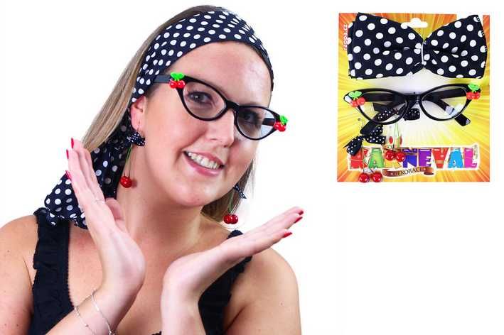 Sada třešňová obsahuje černé brýle, které jsou zdobeny malými třešničkami, třešňové náušnice s puntíkovanou černou stužkou a puntíkovaný šátek. Parádní doplňky na párty!
