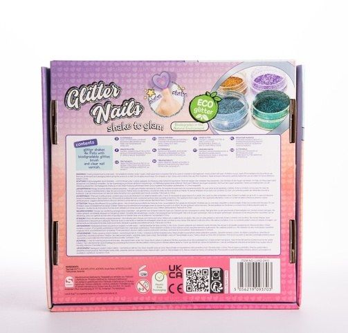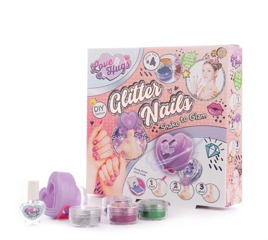 Sada třpytivé nehty Love and Hugs – nalakujte nehty bezbarvým lakem a použijte třpytky. Balení obsahuje 4 kelímky s ekologickými třpytkami, bezbarvý lak na nehty, prstýnek, šejkr a praktický stojánek na mobilný telefon.