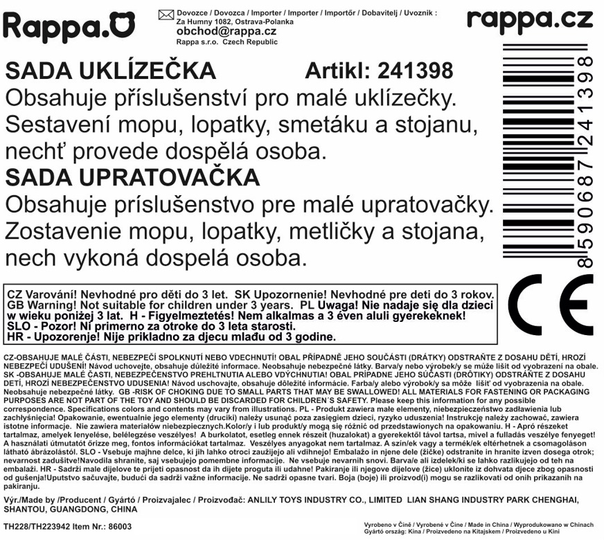 Díky této dětské uklízecí sadě se domácí práce stanou velkou zábavou! Sada pomůcek na úklid pro malé hospodyňky je vyrobena z kvalitního plastu. Sada obsahuje velký smeták, mop, smetáček s lopatkou, kyblík a nádoby jako čistící prostředky. To vše spolu i s praktickým stojanem najdeš v této báječné sadě.
