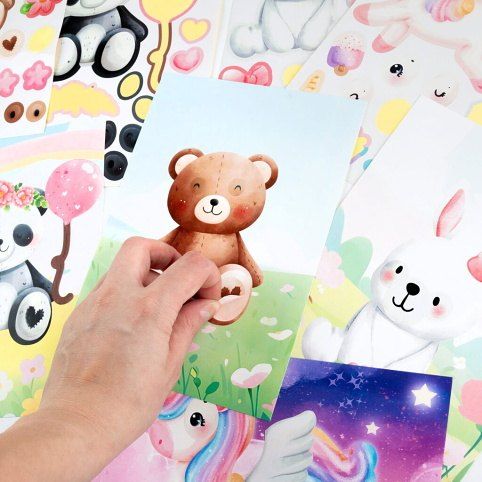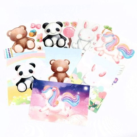 Sada obsahuje 4 archy se samolepkami: jednorožec, medvěd, panda a králíček a kamínky k dekoraci.
