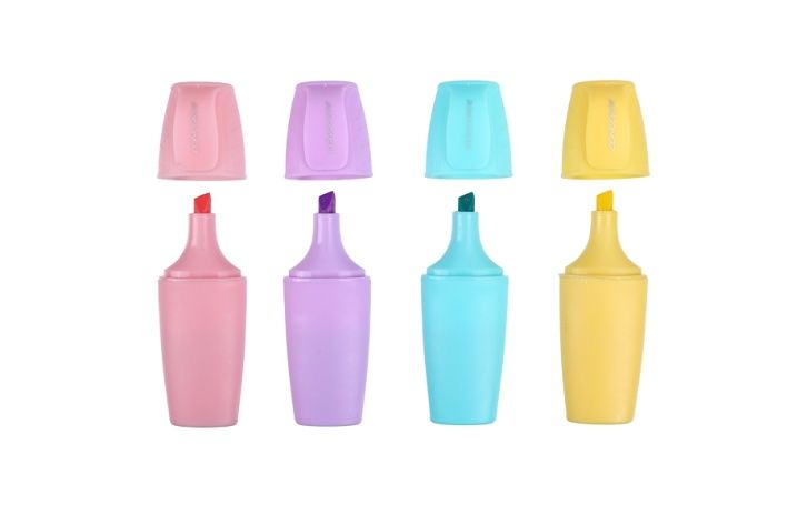 Sada obsahuje 4 mini zvýrazňovače s praktickým klipem na víčku. Zkosený hrot o tloušťce 1-4 mm. Blistr zahrnuje pastelové odstíny: žlutou, modrou, fialovou a růžovou. Tyto malé zvýrazňovače jsou nejen skvělými pomocníky při zvýrazňování textu, ale také se snadno vejdou do kapsy nebo penálu a jsou tak vždy k dispozici.